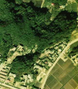 西郭から見た南方の植田方面。 正面の山は富岡館。 島倉山館は右手に位置するが木で 見えない。 |