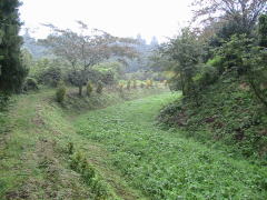 C本郭(右上)南の帯曲輪は畑に なっている。 本郭直下には堀があったらしい。 |