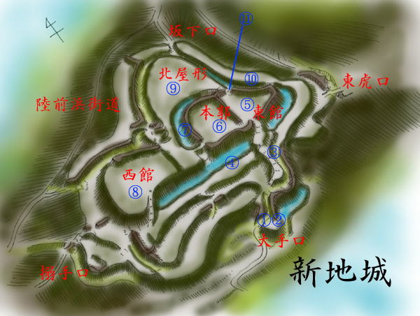 この地は相馬領と伊達領が接する場所に近く、相馬氏により対伊達防衛を目的に、谷地小屋要害が造られる。 しかし、この城は平城であり、防衛上問題があったため、新たにこの新地城を築いたという。 築城は永禄9年(1566)ころという。 相馬氏は、この城と南3kmにある駒ヶ嶺城で伊達氏の侵攻を阻止し、その南の本領を防衛する戦略であったと思われるが、築城当時はまだ伊達氏の勢力はそれほど強大でもなく、相馬氏もかなりの力を持っていた。 両者の勢力境界ははるかに遠方であり、すぐにこの城が戦乱に巻き込まれることはなかった。 しかし、戦国末期、伊達氏の勢力が強大になっていくに従い、やがてこの城も戦乱に巻き込まれていくことになる。 「奥相茶話記」や「東奥中村記」にこの城について記載がある。 それによると、相馬氏は谷地小屋要害を放棄して、新地の山に新しい城を築き、門馬雅楽介を城代に置くが、雅楽介は1年ほどで病死し、泉田甲斐を新たに城代する。 それから、20数年後、このころになると伊達氏は強大化し、それに相馬氏が圧迫される状態となり、この付近が両勢力の境界となってくる。 そして、ついに天正17年(1589)5月、伊達政宗は、相馬氏が田村領に出陣している隙を突いてこの城に攻撃を加え、落城させる。 この時は、相馬義胤が率いる相馬軍の主力は田村領の常葉城へ出兵中であり、城には城代の泉田甲斐、西舘城代の杉目三河以下城兵70騎、歩卒は180人しかおらず、相馬本領には盛胤(義胤の父)の率いる60騎、雑兵360人が留守を守っていたに過ぎなかった。 |