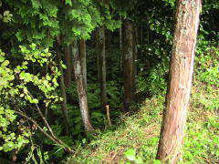 この道沿いの西側に帯曲輪が2段見える。本郭直下には堀があったらしいが、帯曲輪を畑としたため失われている。