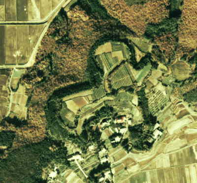 | かつては本郭内部は畑だったという。 右の写真は、国土地理院が版権を持つ30年前、昭和50年ころの新地城付近の航空写真である。 この写真を見ると、本郭を始め、東館、北屋形、大手道周辺もいずれも畑になっていたことが分かる。 曲輪の周囲の切岸や堀は林になっており、くっきり識別できる。 南側の土塁は特に大きい部分があり、櫓があったような感じである。 本郭の西側に虎口があり、土橋を介して西館とつながる。 本郭の北側から西側にかけて幅10mほどの堀があり、明瞭に残る。 この堀は水堀であったというが、この山の上で堀に水を入れることは困難な気がした。 このため、この堀は本来はもっと深い薬研堀で堀内に逆茂木が置かれていたのではないだろうかと思った。 しかし、やはりかつては水があったそうである。 どこかに湧水点があったようである。 このような山の頂上にある堀が水堀であったという例は余り聞かないが、井戸も兼ねたものであったことが想像できる。 |