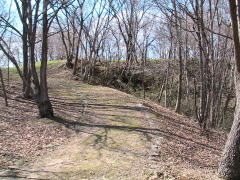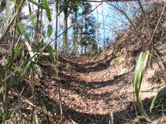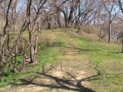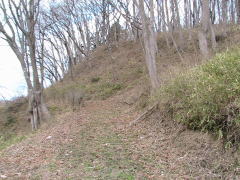 | @館西下の帯曲輪兼登城路。左には土塁がある。 | A本郭南下の曲輪の切岸 | B本郭の西側には土塁がある。 | C本郭西下の帯曲輪 |