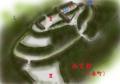西方館の北、500mにある「さくら湖」の中に西側から突き出た半島があるが、その先端部が館跡である。