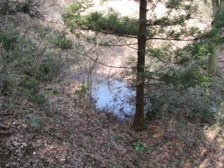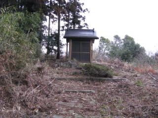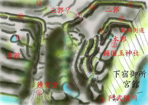 | このルートは登城路ではなく、後付けの参道であろう。 途中の曲輪から北側に堀が延びている。(この堀は本郭の西側から北側を覆うように延びている。) さらに10mほど上が本郭。本郭の南側に20m四方の曲輪があり、その北に一段高く、南北80m、東西30mほどの大きさの曲輪が主要部である。 肝心の社殿は小さいものである。「顕国魂神社」と名前は凄いがなんでだろう。火災にでもあっているのだろうか。 境内すなわち本郭内は藪化しつつある感じである。 東側は崖である。西側の腰曲輪があり、西側から北側にかけて土塁と堀が横矢がかかりながらカクカクして覆う。 堀に土橋があり、そこを出ると二郭である。二郭は60m四方の大きさ。北は丘に続く。 南側にクレーター状の窪地があり、水がある。ここは井戸でもあり、城の水場でもあるのだろう。 その窪地を本郭と西側に延びる尾根が囲み。南側に出口がある。 そこからは水が流れ出ている。 この窪地を囲む西側に延びる尾根に二郭の土塁が延びている。 この方面には行かなかったが、鐘突堂が先端部にあったというので曲輪が存在していたのであろう。 この尾根の北側は切岸となっている。二郭の西に虎口があり、西に大手道が延びていたらしい。 |