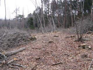 | 北下、県道138号沿いの駐車場から見た城址。 林の部分が三郭、右側が二郭。 |