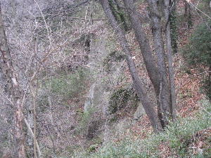 | E三郭(右)と四郭間の堀切 | F四郭北の岩盤剥き出しの切岸 | G北側の帯曲輪群。右上の林が三郭。 左の林が四郭。 |