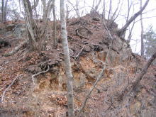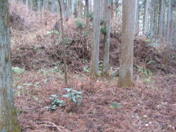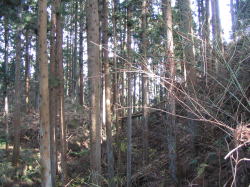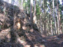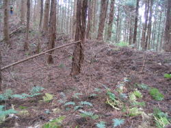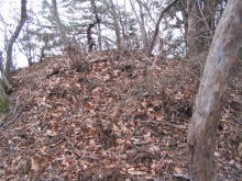 | 木にしがみついて本郭までよじ登る。 おそらく当時は斜面を斜めに登る道が付いていたのであろう。 本郭は細尾根の上部を平坦化させただけのものであり、幅は8m程度しかない。 長さは40m程度あるが、物見台のような土壇が3つあるだけである。 本郭から西側に延びる尾根に曲輪2がある。本郭同様、幅は7m程度と狭いが長さは30mほどある。 この郭はこの城で一番、足元が固くしっかりしている。西側1m下に2段腰曲輪がある。ここもしっかり造られている。 本郭から南東側に延びる尾根には堀切があり、その先に物見台のような6の土壇がある。 本郭より30m下の地点である。これもしっかり造られている。 その先はまた登りになり、南出城がある。直径8mほどであり、単なるピークの先端を平坦化したものに過ぎない。 その先は尾根が続く。堀切や曲輪があるというがそこまでは確認しなかった。 ここを行くと八溝金山まで行けるとのことであり、この城が金山と大きな関係があったらしいことが示唆される。 一方、本郭から南東に延びる尾根には7等の2段の曲輪があるが、明瞭な曲輪は認められない。 単なる斜面にしか見えない。長年の年月で埋もれてしまったのであろうか。 曲輪の切岸は、石垣のようなものがあるが、自然のものであろう。 |