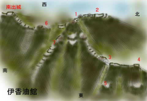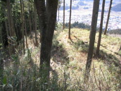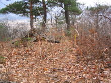 | 5の物見手前の堀切。 | 南出城。単なる平坦地に過ぎない。 | 7の曲輪を見上げる。 | 東山麓から見た城址。 |