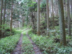 | 東から見た羽黒山。城域はこの山全体。中央のピークが本郭部。左下の茂みが平館跡。 | Fの土塁間を通る出羽神社参道。 |
