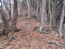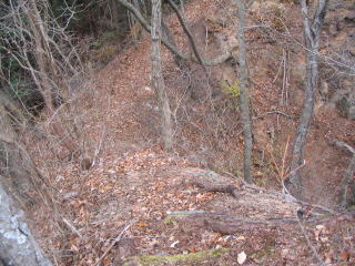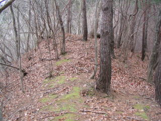 その南は大竪堀になり、そこを越えるとまた、物見用の平坦地5に出る。 この付近の斜面も急勾配である。道が付いているのはここまでであり、主郭部に行く道はない。 藪の中を強行突破することになるが、急斜面と藪との格闘である。冬場でなければとても突撃不能である。 この斜面を突破し、高度差20mを登ると物見4のある尾根に出る。 この部分は若干の広さがあるが、堀切3までの尾根上は1m程度と狭い。 西側は絶壁である。 堀切3は岩をくりぬいたような感じであり、本郭側からの深さは5m、幅は10mほどある。 両側は竪堀となっている。 堀切の中央部は土橋状になって、本郭側に行くようになっている。 塙町史によると大手道はこの西側の谷を上がる道となっているが、どう見てもこの絶壁を登れるようには思えない。 この堀切から本郭までは高さで30mある。 途中に曲輪らしいものがあるが、不明確である。 |