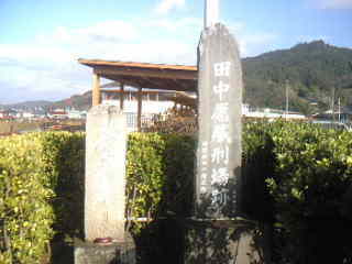 水戸天狗党のテロリストというか、強盗放火常習犯 田中愿蔵の墓が、福島県塙町の久慈川沿いにある道の駅「天領の里」の脇にある。右の写真がその碑である。後ろに写っている山が羽黒山城である。