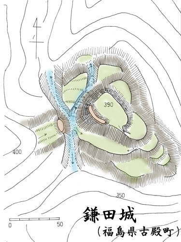 | これは物見の曲輪であろう。この先は一度低くなりまた上りとなる。 尾根先端部に向かって歩くと巨大な堀切があった。 かなり埋没しているが、幅は20m、現在でも深さ5mはある。本来の深さは8mはあったのだろう。 西側を見ると本郭側に堅土塁を持って竪堀が西に下る。 この堀が林道脇で見たものである。 誰も来ないような山の中でこのような光景を見るほど心ときめくことはない。(病気だ!) 堅土塁から本郭に登ると北側堀切側に直径10mほどの土壇がある。 その南に25m×20mほどの本郭が広がり、南に開いた虎口を出ると下4mに長さ30mの二郭があり、西下に帯曲輪がある。 館という名であるが「やかた」ではなく、「たて」である。 小規模ながら立派な戦国時代の戦闘城郭である。 しかも完存状態である。 石川方面、鮫川方面、古殿方面への分岐点にある城であるので交通の要衝を抑える城であろう。 おそらく鎌田氏の築城と思われ、戦国時代は竹貫城の西を守る砦であったのだろう。 |