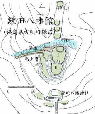 この鎌田八幡神社は祭神に誉田別命を祀っており、天喜2年八幡太郎義家が、前九年の役で安倍貞任の追討に向かう折、ここに陣小屋を建てたという。 これが裏山の城址のルーツなのかもしれない。 後でその跡を石関山八幡と号して崇めたものという。 さらに文治4年竹貫源次郎光清が鎌倉の鶴岡八幡官を奉遷勧請し、社殿を造営したという。 しかし、これは竹貫氏ではなく満田氏であろういう。(古殿町史参照) いずれにせよここに源氏の氏神八幡社があることは清和源氏石川氏の一族が根を張っていた証拠でもある。 城址はこの社殿の裏のようである。しかし、勾配が急で藪もきついので直登は無理と判断。 このような尾根の突端にある城は尾根中腹を山側に歩き、登りやすいポイントを見つけて尾根の上に出るのがミソ。 このため、西側の林道を少し北に歩き、尾根に取り付く。 途中に竪堀みたいなものがある。(これは本物の竪堀であった。) 道のない雑木林の中を歩いて尾根に出る。尾根上までの道はそれほど藪ではない。 尾根上に出ると平坦な場所が3つある。 北の山側に歩くと尾根上に直径10mほどの平坦地がある。 |
