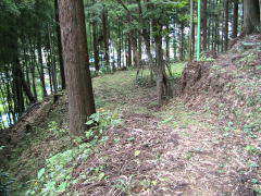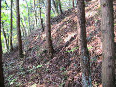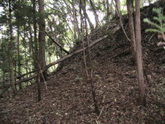 神社社殿西の平坦地は曲輪か? | 本郭北の巨大な堀切。右が本郭。 | 堀切から西に延びる堅土塁と竪堀。 |