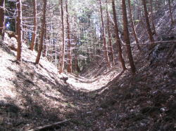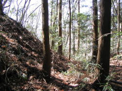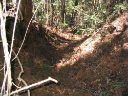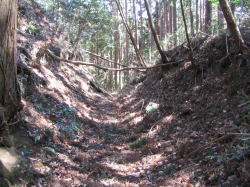 | @ 最南端薬師堂出城北の堀切。 深さ10m以上、切通しの道として使われ ている。 |