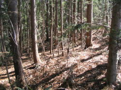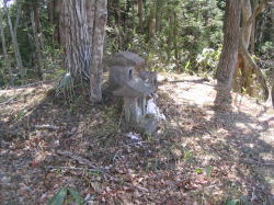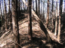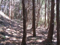 | 本郭東の枡形虎口。 杉が鬱蒼としていて良く形状が分からない。 |