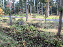 土塁上から南の一段高い部分を 見る。左が神社社殿。 |