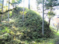 | 本郭東下に石門のような場所がある。 | 本郭南下の帯曲輪。西側まで半周する。 | 北から見あげた本郭。 | 本郭南下の曲輪。土塁が東側を覆う。 |