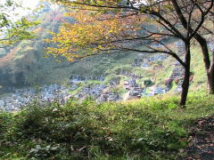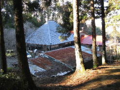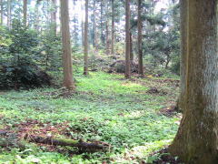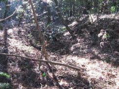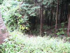 | 神社参道。巨岩が林立する。 | 西館と本城部を区切る堀切の北側。 | 西館内部。遺構は余り明確ではない。 | 西館の南端。土橋状の尾根で南の 山地に続く。正面の山にも砦があった。 |