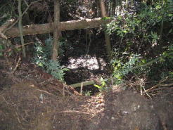 | @宝海寺の地は居館跡だろう。 | A 井戸と思われる穴。水がある。 | B 本郭の土塁であるが、藪。 |