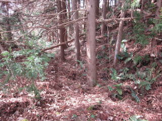このため、保守用の道の登り口から竹林の中を西に向かう。すると杉林の平地がある。ここから南の尾根にとりつく。