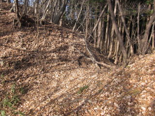 | @曲輪Uの斜面には石積が確認できる。 | A本郭と曲輪U間の堀であるが杉の落ち葉で 埋もれている。 |