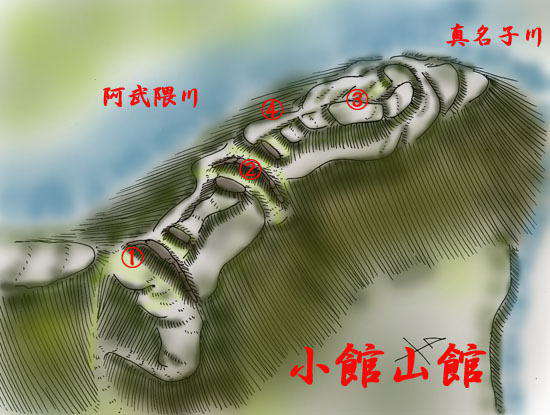 小館山館のある山は南から半島状に北に突き出た尾根であり、その先端部が館である。