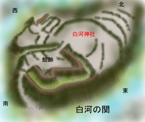その白河の関であるが、山間の独立丘陵に築かれている。 この丘は低地側の北から見ると比高25mであるが、南側から見ると10m程度の比高。直径300m程度の大きさである。 おそらく周囲は湿地帯であり、西側に街道が通っていたのであろう。 関のあった場所には現在、白河神社が建つ。西からの参道の斜面には5段の段郭があり、浅い堀跡がある。 神社の地は平坦であり、北側も段郭が築かれている。ここまではいかにも古代の関といった雰囲気である。 しかし、神社の南東側を見ると古代から中世初期とはとても思えない遺構がある。 まず、幅10m以上もある大きな堀が南側と東側に向かって延びている。 郭内には土橋を経由して入るが、郭内は北側と東側に高さ2、3mの土塁がある。 南東の虎口から出ると堀が北側から東側を回って半周し、外側に土塁がある。 ご丁寧に南東端には櫓台のように高くなっており、その部分に横矢がかかっている。 これはどうみても横堀を持つ戦国時代の館である。 ここが関の責任者の居館であるというが、平安末期に既にこれほどの城郭技術は存在していたのだろうか? 戦国時代に誰かが手を加えているとしか思えない。 戦国時代、この地は白河結城氏と那須一族芦野氏の領国境界に近いので白河結城氏が整備した可能性がある。 さらに関が原前夜、白河に陣を置く上杉軍と黒羽などに前線を置く徳川軍のにらみ合いが起る。 その対陣の前哨陣地として上杉軍によって整備された可能性も考えられる。 |