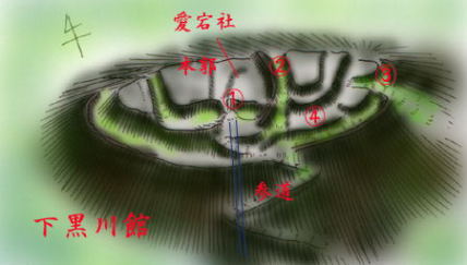 場所は南に県境である黒川が流れ、その流れを見下ろす比高40mの山にある。