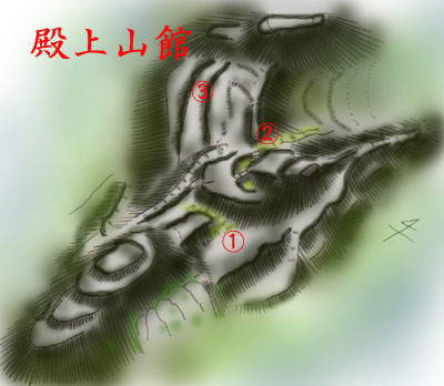 堀切館と同じように西から東に突き出した尾根状の山の比高30mほどの先端部を利用した館である。