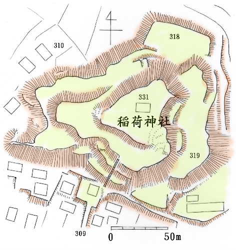 本郭に建つ稲荷神社。 内部は平坦である。 |