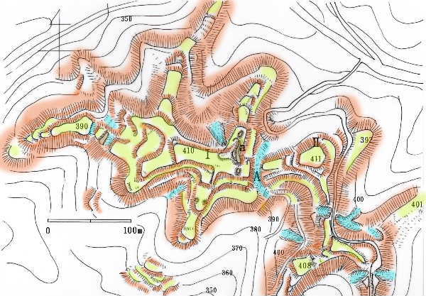 本郭下の曲輪から見下ろした曲輪群。 |