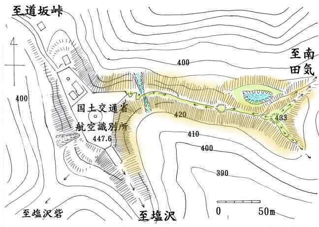 遺構があるのは、太郎山から尾根を約800m南下した標高355.3mの「塩沢権現山」の山頂に建つ「富士権現」の境内を北端にそこから南約250mにかけての尾根沿いが範囲である。