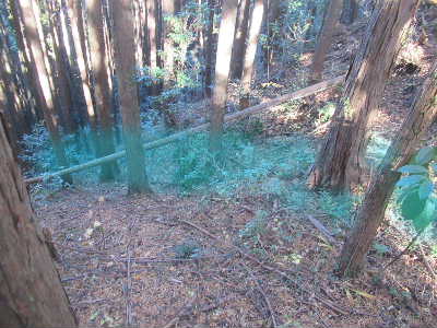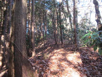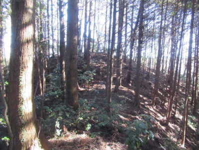 一方、南西側には緩い尾根が続く。 この尾根の南東側斜面は勾配が緩く帯曲輪のようなものがあるが、尾根直下のものを除き、植林に伴うもののようである。 |