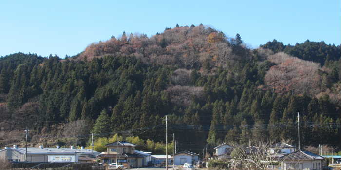 里美の盆地の南端部、国道349号線と国道461号線が交わる折橋の交差点の南東側に見える山にある。