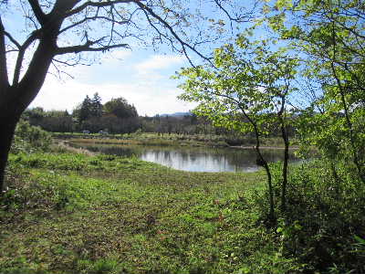 南側、常浪川南岸から見た城址、岩山が麒麟山、遺構は川べりと麒麟山の左側(西側)に展開する。