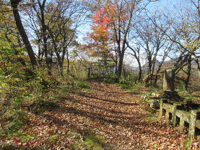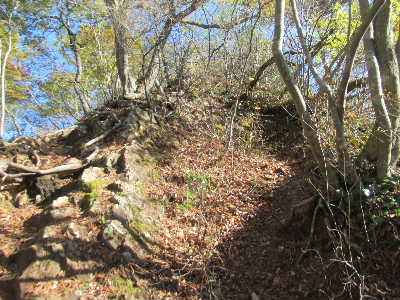 遊歩道を西に進むと、搦手口の土塁@がある。