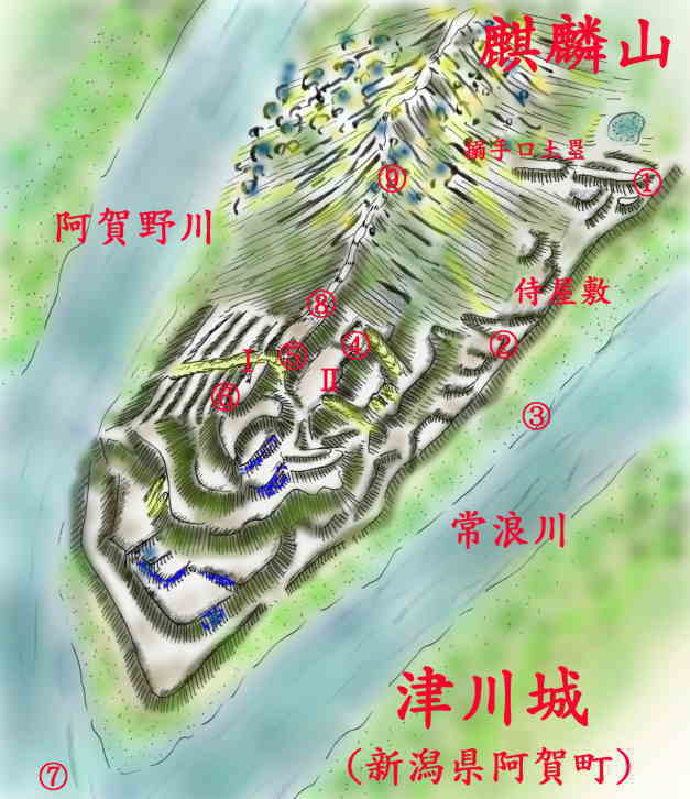 津川城は阿賀野川と常浪川に囲まれた標高191mの麒麟山の常浪川沿いの南側から西側にかけて築かれている。
