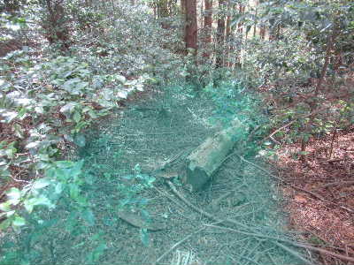 | C本郭手前の最後の堀切、深さ約1.5m、幅約3m。 | D本郭内部には富士浅間社の石祠がある。 | E本郭東は緩やかに下る。この付近に堀切があったような・・ |