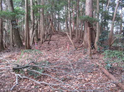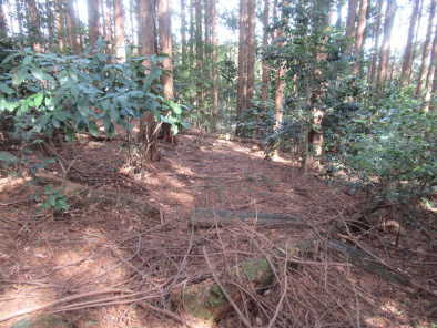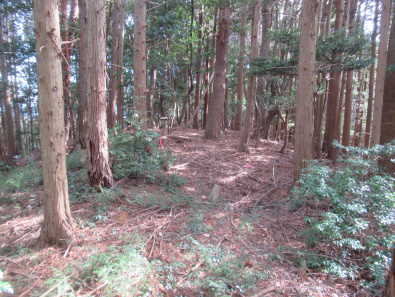 東に少し尾根が下り、段々にはなってはいるが、段差は約1m程度に過ぎなく不明瞭である。