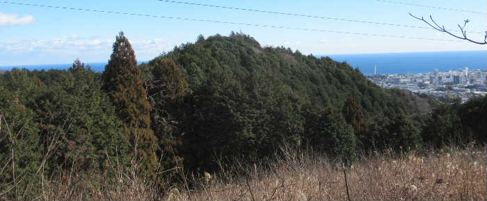 | 東側の「かみね公園」から見た城址 | 尾根続きの西側から見た城址、遠くに太平洋と日立市街が見える。 手前の薮がトゲトゲ地獄、右側の斜面部に迂回して城に向かう。 |