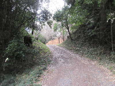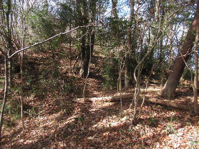 | 配水場前から見た主郭部虎口 | 主郭部前の切通しは堀切C | 南端にある堀Dは竪堀となって下る。 | 主郭部の虎口を入ると郭5、土塁が覆う。 |