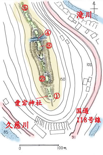 南端部は久慈川と滝川はこの山の南で合流し、渓谷状になっているので防備を考慮する必要はない。