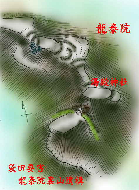 さらに標高133mの鞍部を越えた北側の湯殿社が建つ標高145mの地及びその北側、龍泰院の裏山にも帯曲輪のような場所もあるので、ここも城郭遺構の可能性がある。