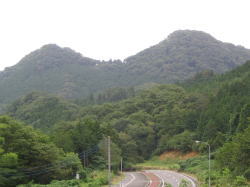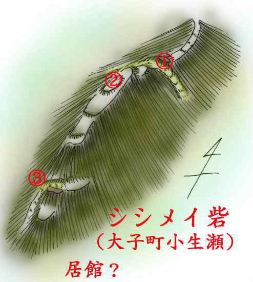 | ←城の麓から西を見ると月居城(左の山)が。 この城と連携を取っていたことが推定される。 写真下側を高瀬川が流れ、大野川が合流し、写真右端部にある袋田滝を下る。 西に月居城が見えるのでその出城であったと思われる。 南麓の民家の地が「シシメイ屋敷」と呼ばれ、城主の居館があったと思われる。 地名の「シシメイ」って変わった名前である。 カタカナというのも変わっている。 調べてみると「シシメイ」は、アイヌ語が語源であり、「滝の注水点」という意味という。 明らかに袋田滝の水が流れ落ちる場所を指している。 |