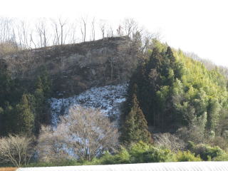 ↓は戸中集落の民家の屋根越に見た城址であるが、この山の写真がなかなか撮れない。