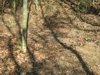 この平坦地から東の山に登って行く場所は比較的、藪は少ない。