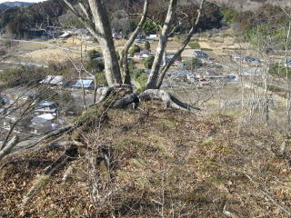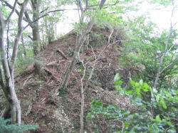 山の尾根に出ると堀切があり、さらに北に15mほど登ると、L型のコーナー部に当たる北側から目だって見える断崖上のピークが櫓台状に聳え立つ。