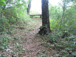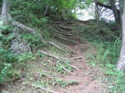 | 鞍部から主郭に登る途中の腰曲輪。 | 主郭部への登口。木の根にしがみつい て登らなければならない。 |