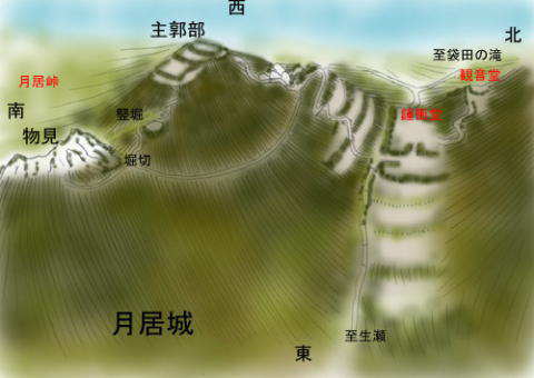 堀切の南にそびえる岩は高さ15m程度あり、その頂上は南方下の月居峠を監視する物見台であったと思われる。